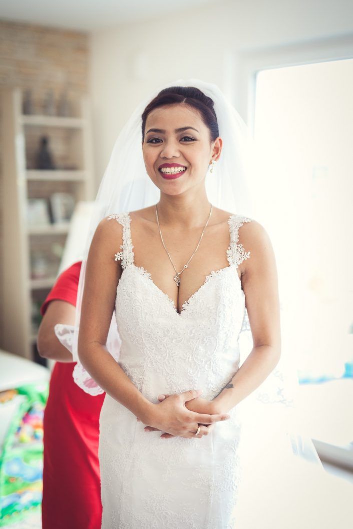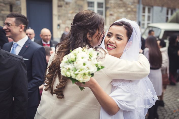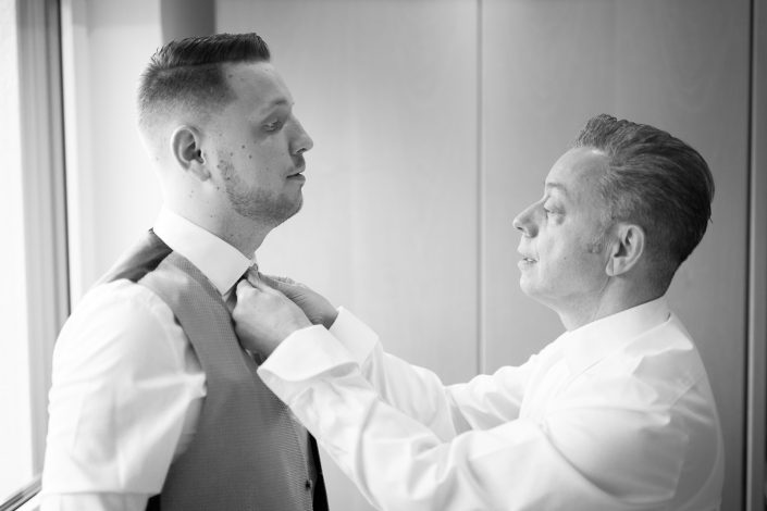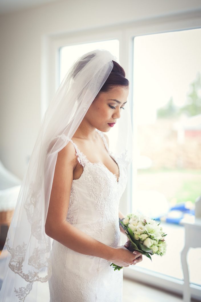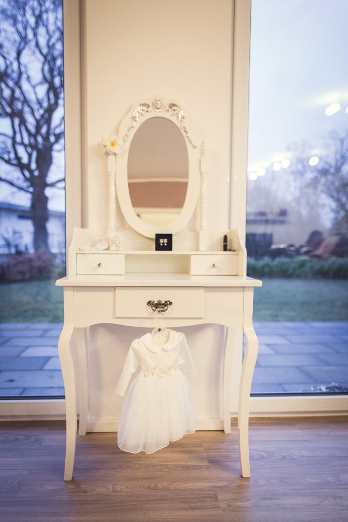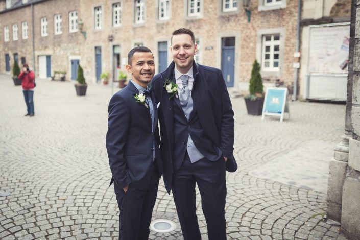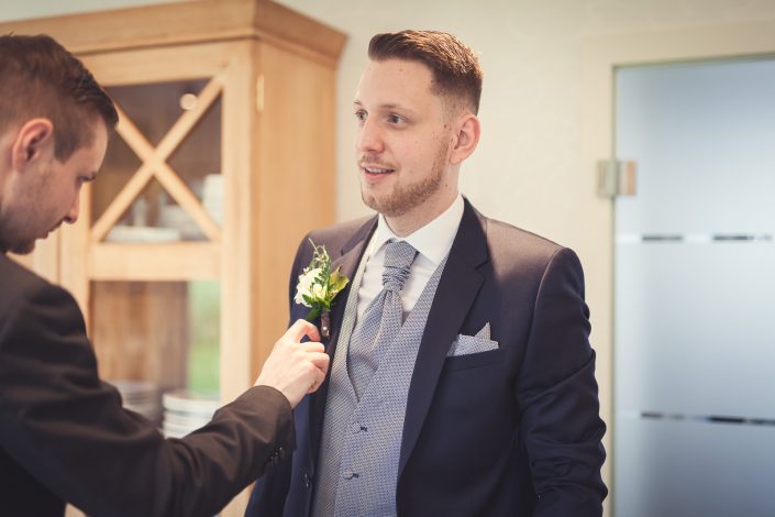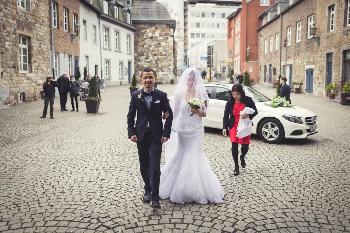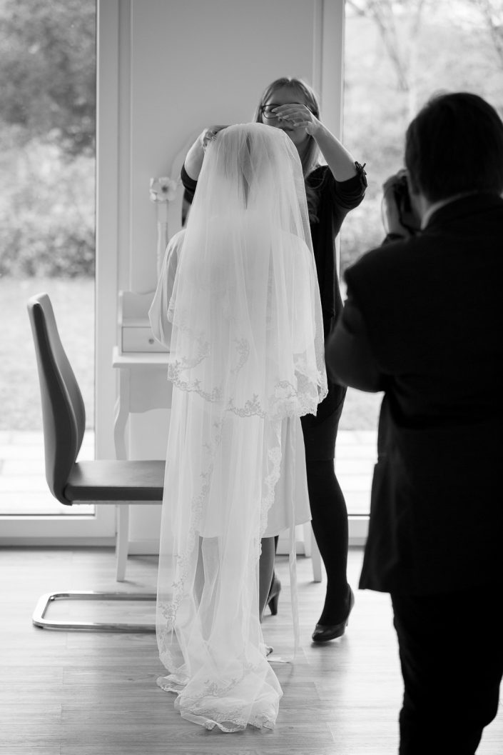 2017 starteten wir bereits im Februar mit unserer ersten Hochzeit. Begleitet haben wir Petra und Thomas bei ihrer kirchlichen Trauung im Aachener Dom und anschließender Feier auf Schloss Vaalsbroeck. Wir starteten schon am frühen Morgen bei Petra Zuhause. Dort wurde sie von einer Stylistin im Beisein ihrer Freunde und der Familie gestylt. Nach den ersten Getting-Ready Fotos von Petra fuhren wir ein paar Straßen weiter zu Thomas, der sich bei seinen Eltern in Schale warf. Von dort aus ging es für uns noch einmal rüber zur Braut, wo wir die letzen Detailaufnahmen vom Anziehen, dem Kleid und den Accessoires machten konnten.