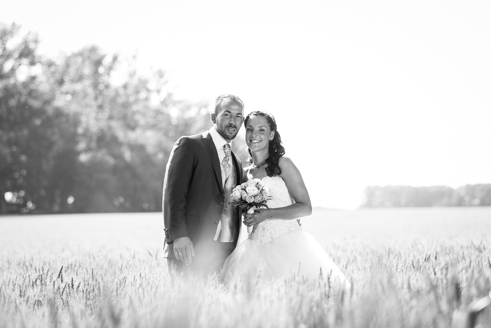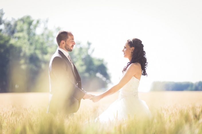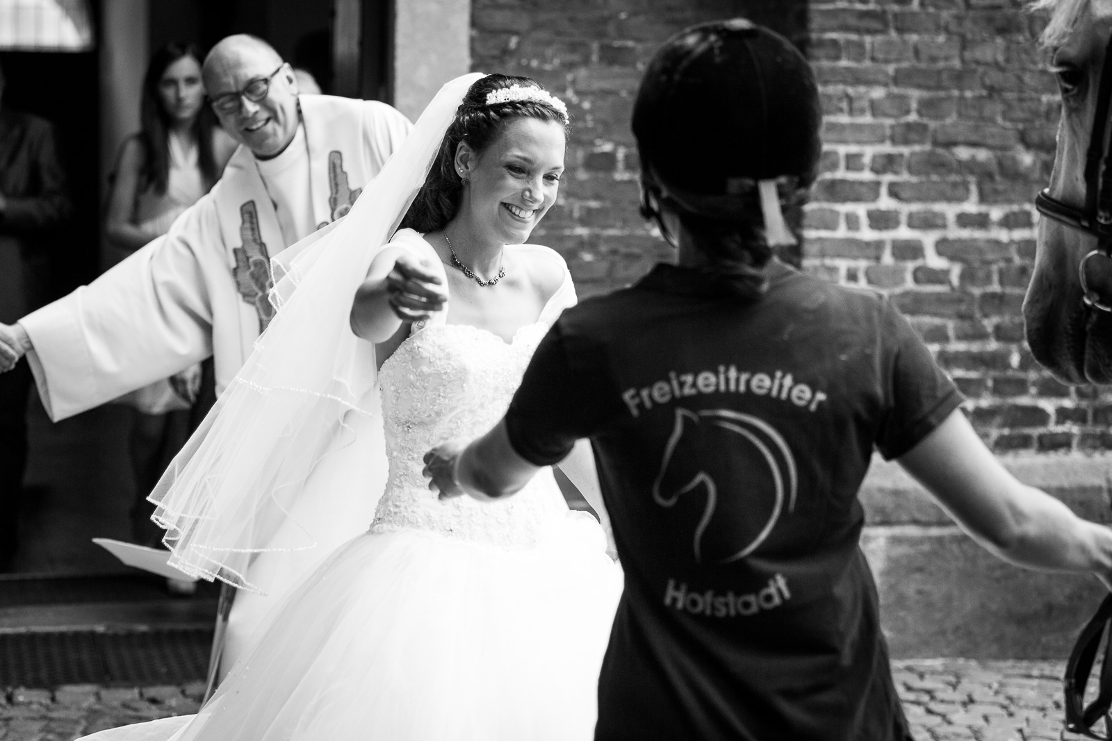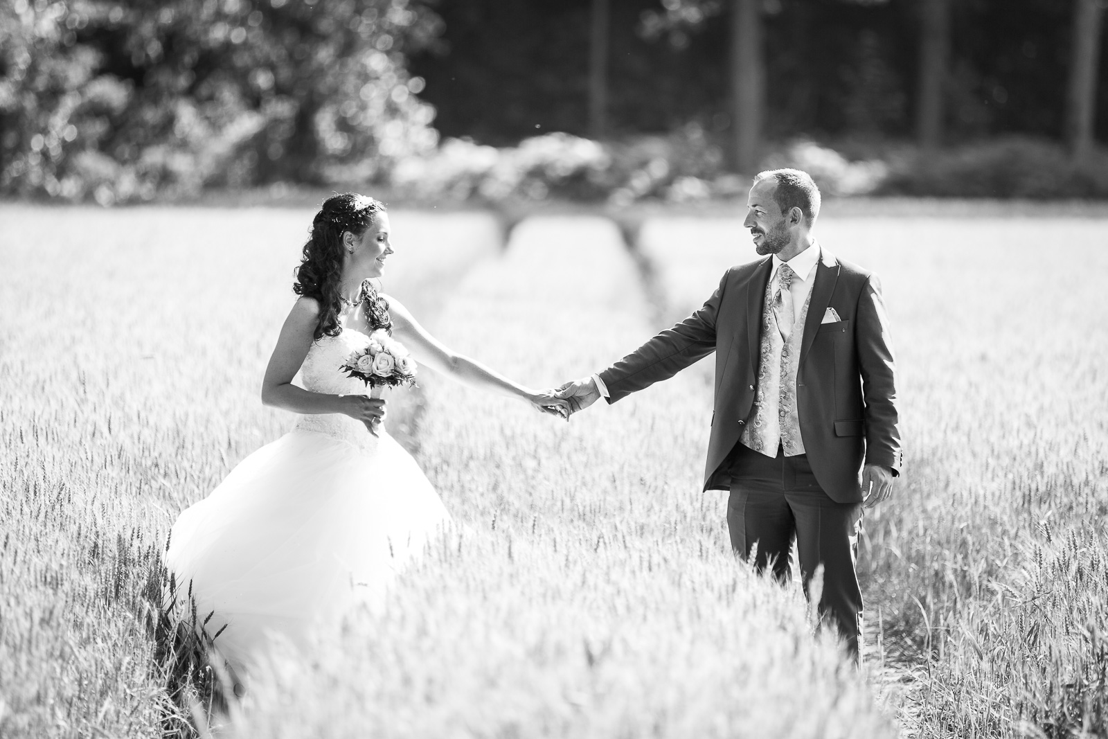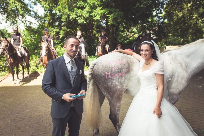 Auch nach der Trauung riss die Liebe zum Tier nicht ab, denn Freunde vom Reitstall saßen auf ihren Pferden vor der Kirche und überraschten das Brautpaar. Von dort aus zogen Mandy und Marcel in der Kutsche in Kolonne mit den anderen Reitern wieder in Richtung Elternhaus, denn sie mussten dort ihr Gefährt schnell wechseln, um mit mehr Pferdestärken in Richtung Forsthaus Weiden zu fahren. Das Shooting machten wir in dem angrenzenden Wald und den danebenliegenden Feldern. Für das perfekte Bild war Mandy für jeden Spaß zu haben und kletterte beispielsweise Barfuß mit ihrem Hochzeitskleid in ein Feld. Hat sich gelohnt oder?