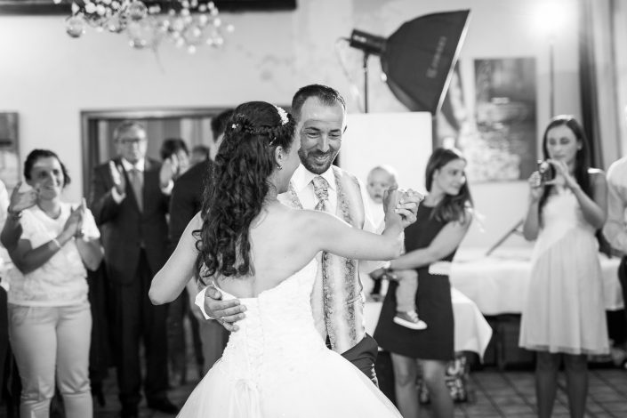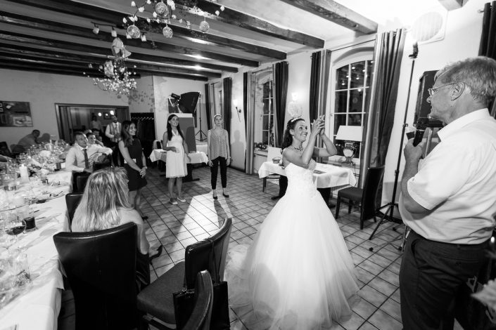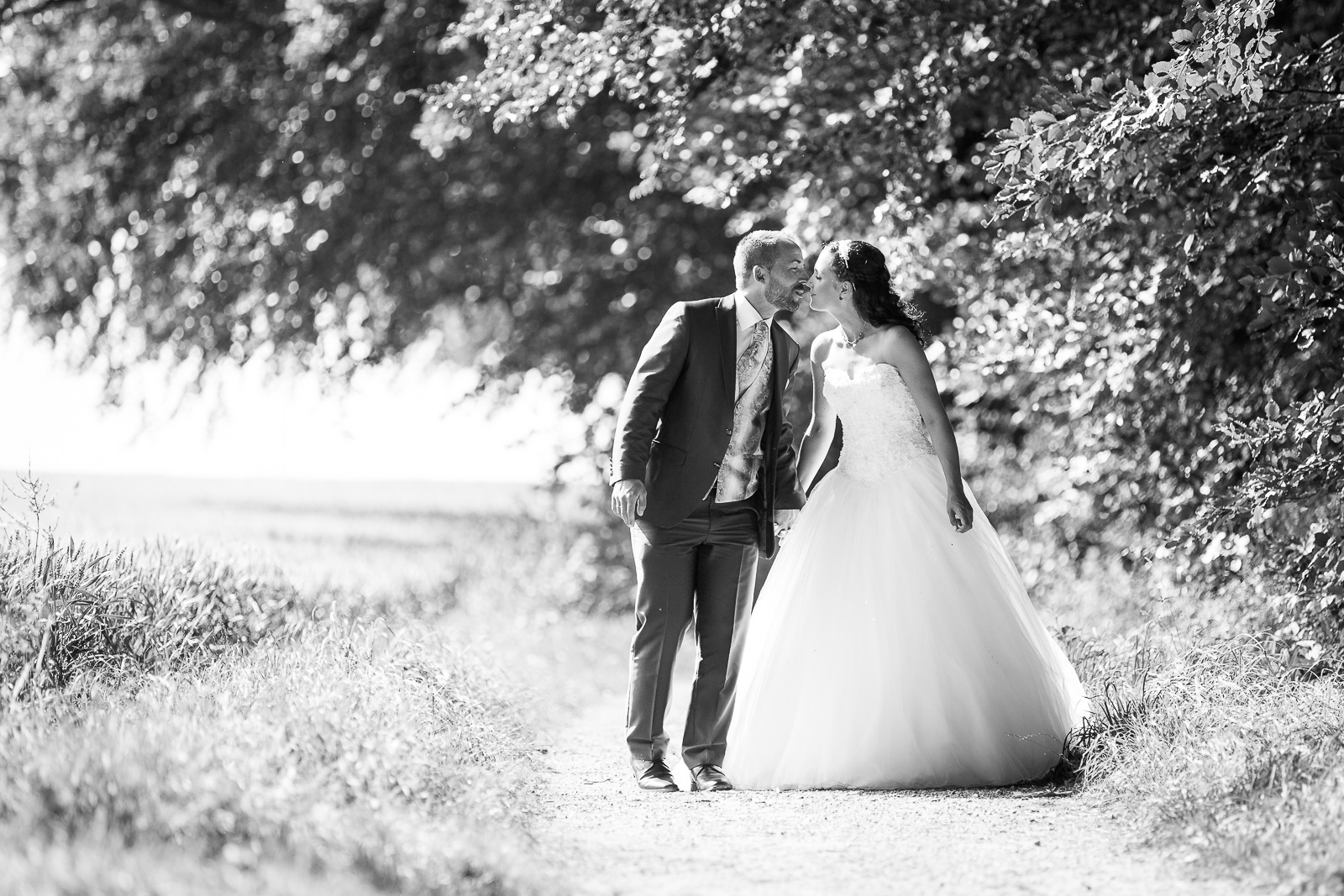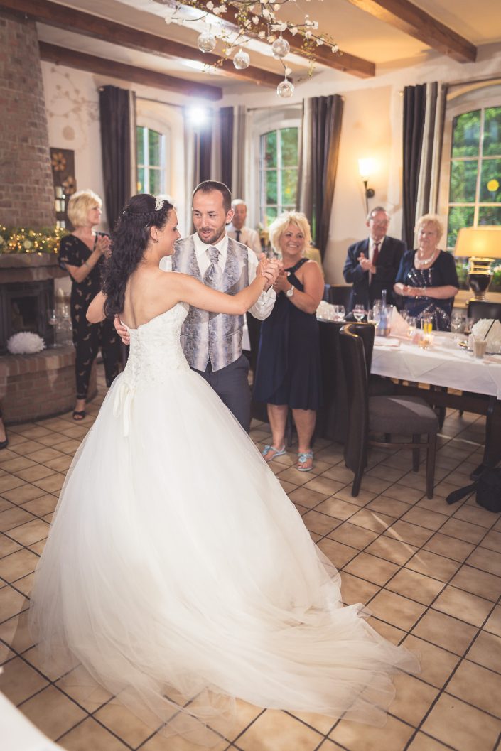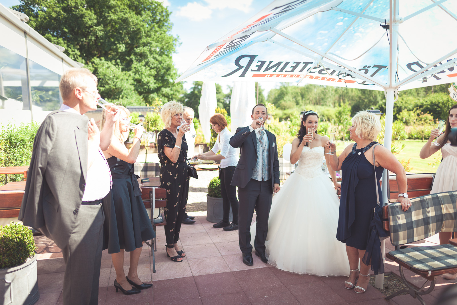 Auch nach der Trauung riss die Liebe zum Tier nicht ab, denn Freunde vom Reitstall saßen auf ihren Pferden vor der Kirche und überraschten das Brautpaar. Von dort aus zogen Mandy und Marcel in der Kutsche in Kolonne mit den anderen Reitern wieder in Richtung Elternhaus, denn sie mussten dort ihr Gefährt schnell wechseln, um mit mehr Pferdestärken in Richtung Forsthaus Weiden zu fahren. Das Shooting machten wir in dem angrenzenden Wald und den danebenliegenden Feldern. Für das perfekte Bild war Mandy für jeden Spaß zu haben und kletterte beispielsweise Barfuß mit ihrem Hochzeitskleid in ein Feld. Hat sich gelohnt oder?