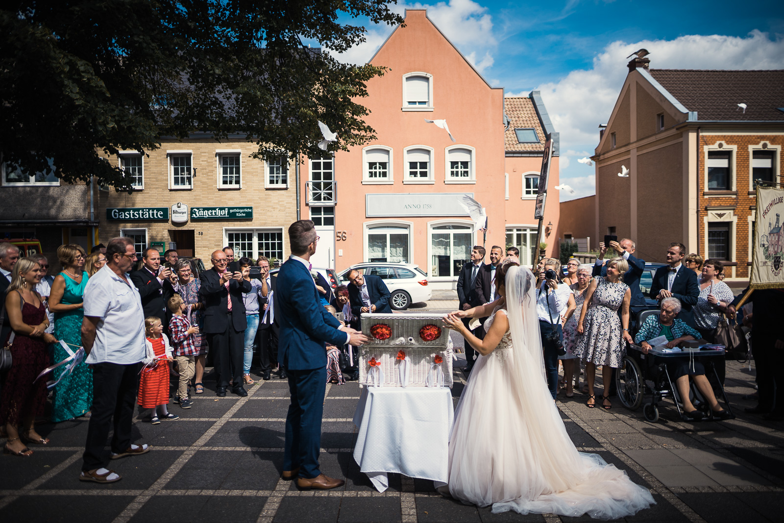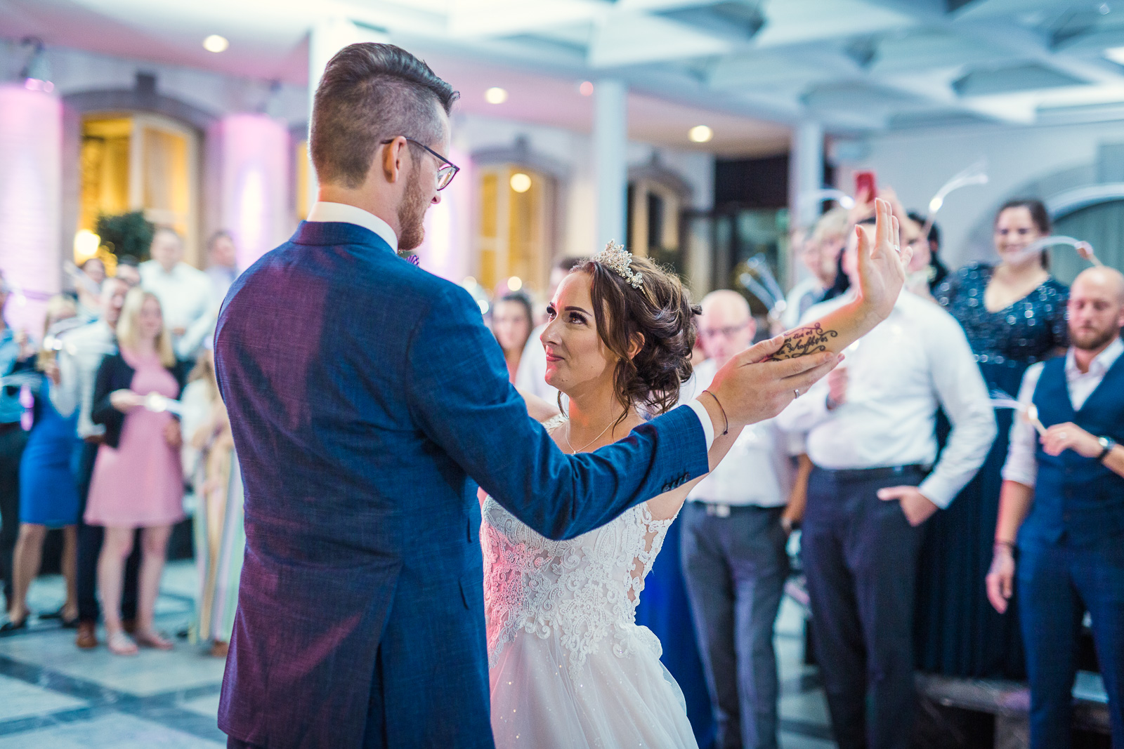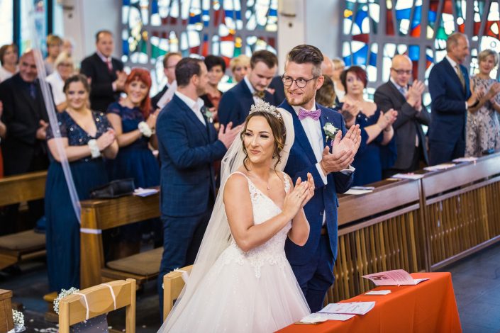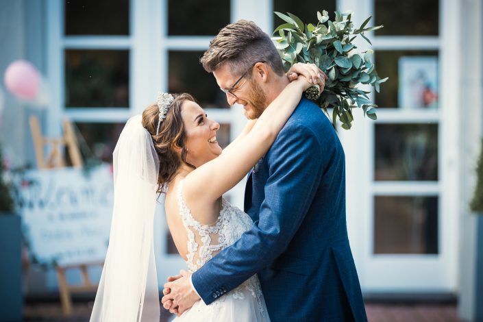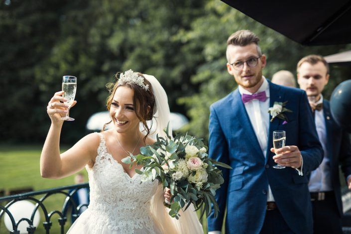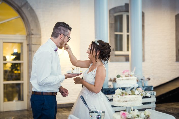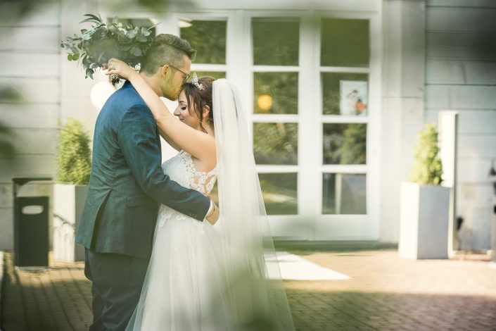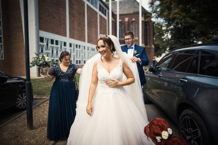Geheiratet wurde in der Kirche Sankt Lambertus in Hückelhoven, die liebevoll mit einem Luftballon-Spalier geschmückt war. Es war ein traumhafter Anblick für den Bräutigam, die Gäste und natürlich uns :), als die Braut durch dieses Spalier zog. Im Anschluss ging es für uns ins Schloss Rahe, wo das Shooting und die anschließende Feier stattfanden. Auch wenn das Gelände des Schlosses sehr gepflegt ist, findet man doch ein paar Ecken die ein bisschen wilder sind, die sich perfekt für ein Shooting anbieten. Wir lieben es natürliche Bilder zu machen und Momente einzufangen und daher sind uns Shooting-Location die nicht das perfekte Gelände bieten am liebsten. Die Party ging bis spät in die Nacht und brachte so einige Überraschung, wie z.B. den Auftritt von Mike Leon Grosch, mit sich. Es war eine perfekte Party mit vielen stimmungsvollen Moment.
