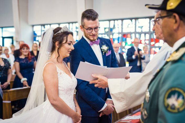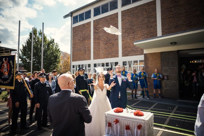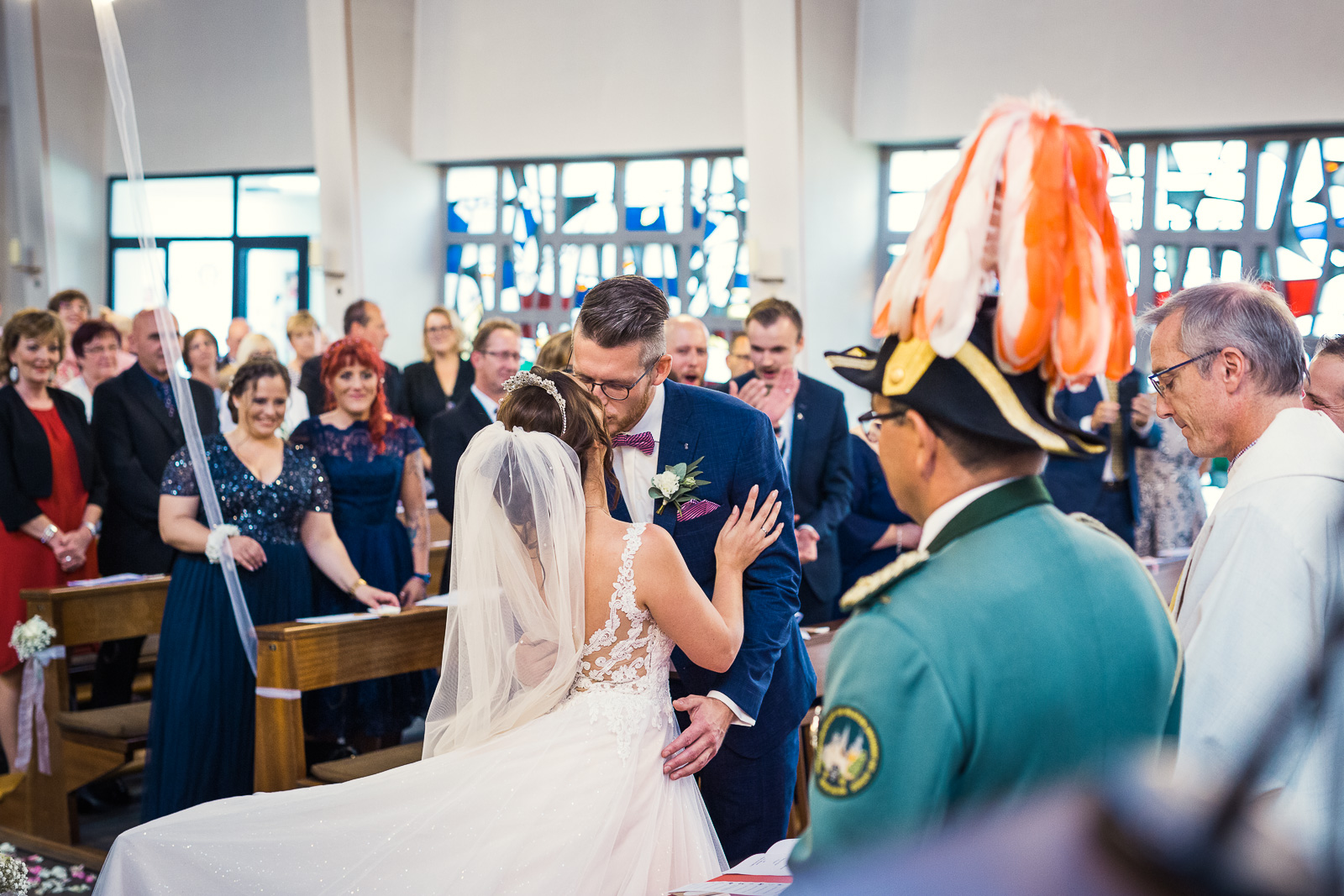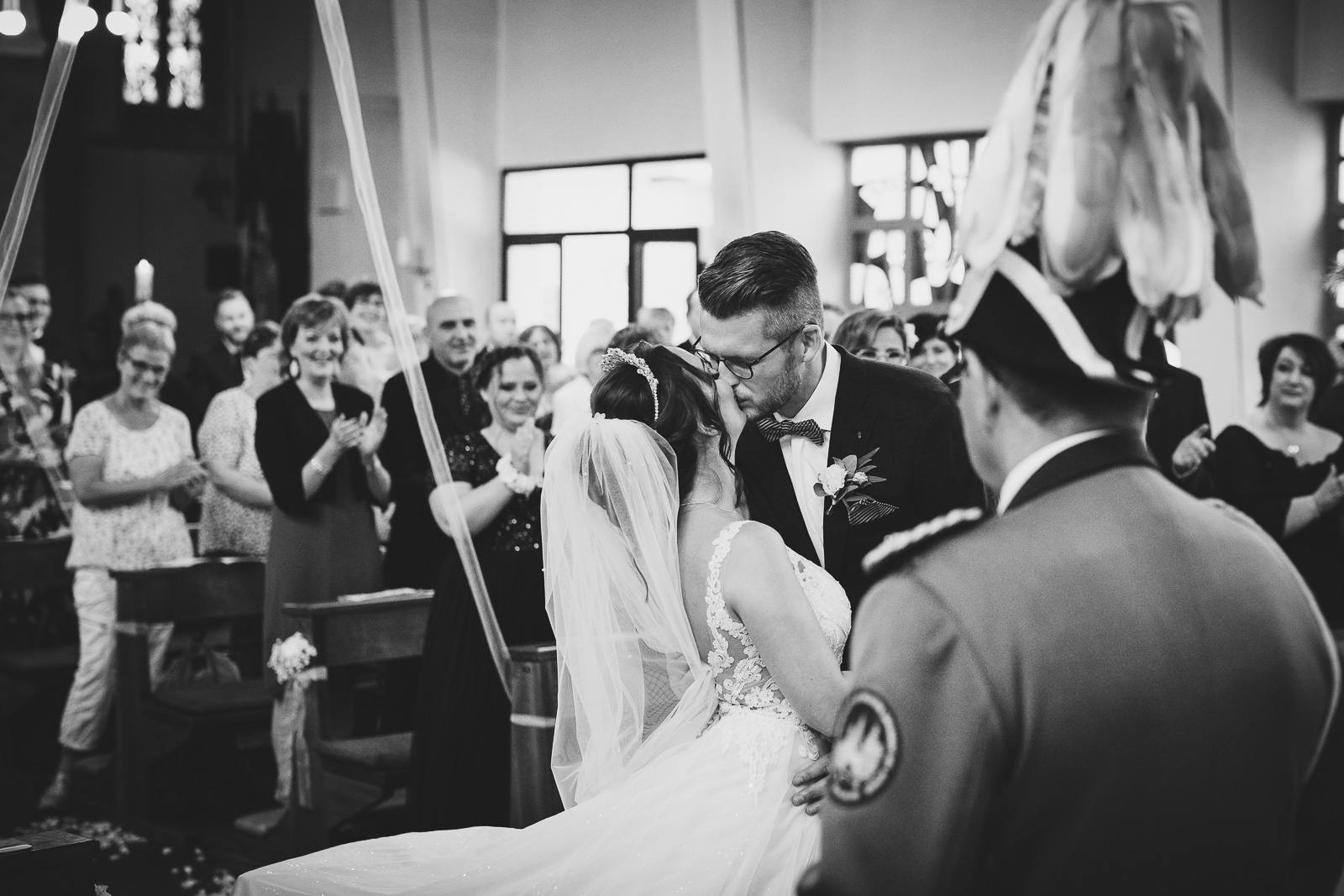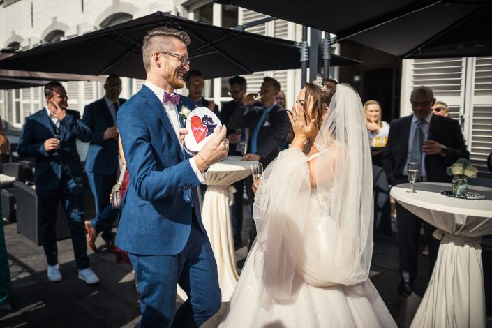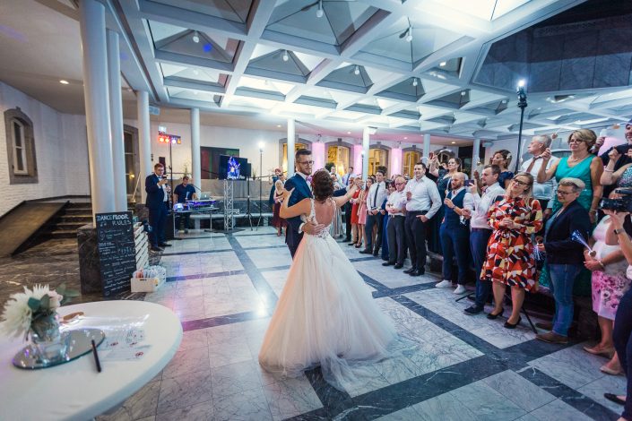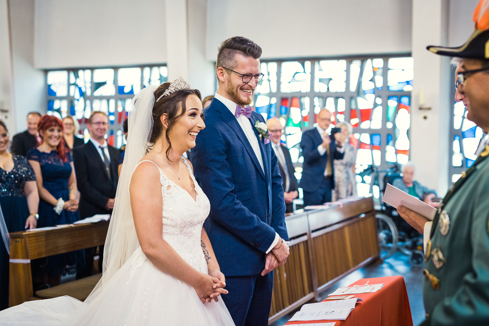 Geheiratet wurde in der Kirche Sankt Lambertus in Hückelhoven, die liebevoll mit einem Luftballon-Spalier geschmückt war. Es war ein traumhafter Anblick für den Bräutigam, die Gäste und natürlich uns :), als die Braut durch dieses Spalier zog. Im Anschluss ging es für uns ins Schloss Rahe, wo das Shooting und die anschließende Feier stattfanden. Auch wenn das Gelände des Schlosses sehr gepflegt ist, findet man doch ein paar Ecken die ein bisschen wilder sind, die sich perfekt für ein Shooting anbieten. Wir lieben es natürliche Bilder zu machen und Momente einzufangen und daher sind uns Shooting-Location die nicht das perfekte Gelände bieten am liebsten. Die Party ging bis spät in die Nacht und brachte so einige Überraschung, wie z.B. den Auftritt von Mike Leon Grosch, mit sich. Es war eine perfekte Party mit vielen stimmungsvollen Moment.